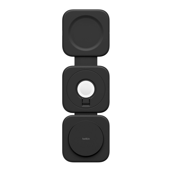 - Carga tus dispositivos esenciales con un soporte plegable increíblemente cómodo y que te puedes llevar contigo de viaje. Suministra 15 W de carga inalámbrica rápida a tu iPhone con MagSafe, además de 5 W a un Apple Watch y 5 W a unos AirPods. Gracias a la tecnología Qi2 es tan sencillo como colocar tu iPhone sobre la superficie de carga para establecer una conexión segura y perfectamente alineada.