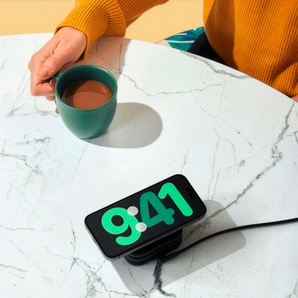 - Basado en pruebas internas. Este cargador inalámbrico Qi2 de 15 W de Belkin carga un iPhone 15 de 0 al 50 % el doble de rápido que un cargador inalámbrico Qi de 5 W y 1,5 veces más rápido que un cargador inalámbrico Qi de 7,5 W. Los tiempos de carga varían según los factores del entorno; los resultados podrán variar.