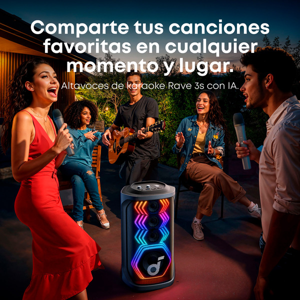 Deja que tus invitados se conviertan en las estrellas de tu próxima fiesta en el patio con el parlante Rave 3s AI de Soundcore. Todos pueden cantar sus canciones favoritas usando el par de micrófonos inalámbricos incluidos y la función AI Vocal Removal, ajustando el volumen de la pista vocal, utilizándola como guía en canciones que no conocen o apagándola por completo para mostrar su talento. También tiene una entrada para guitarra para que los músicos se unan a la diversión, o puedes relajarte y dejar que los 200 W de potencia llenen el espacio con tu playlist favorita. Sea cual sea la canción, un espectáculo de luces multicolor sincronizado con el ritmo completa la fiesta.